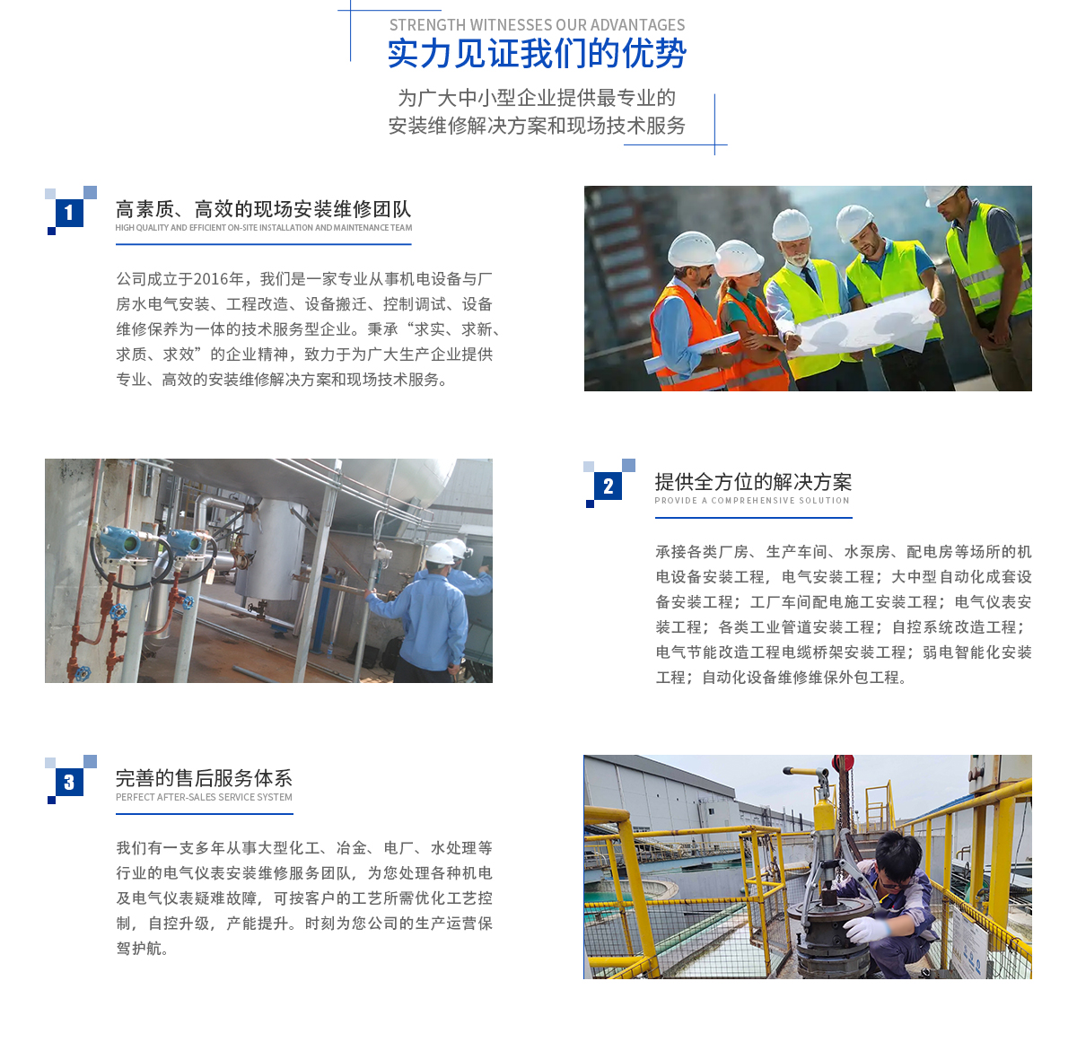 公司成立于2016年,我們是一家專業從事廠房設備水電氣與機電設備安裝、工程改造、設備拆裝搬遷、控制調試、設備維修保養為一體的技術服務型企業。秉承“求實、求新、求質、求效”的企業精神,致力于為廣大生產企業提供專業、高效的安裝維修解決方案和現場技術服務。專注于工廠各類機電設備、電氣設備、自動化儀器儀表、工業自動化成套控制系統、 弱電智能化及商用制冷設備的工程安裝與維修改造;同時,對處理水災、火災受損機電與電氣設備的現場勘察、搶修亦有豐富經驗。承接各類工廠、廠房、生產車間、水泵房、配電房等場所的機電設備安裝工程,電氣安裝工程;大中型自動化成套設備安裝工程;工廠車間配電施工安裝工程;電氣儀表安裝工程;各類工業管道安裝工程;自控系統改造工程;電氣節能改造工程(變頻節能/儀表自控節能);電纜橋···